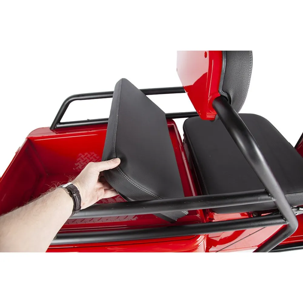 Модель оснащена мягким сиденьем, повторяющим анатомические части тела и снижающими нагрузку с позвоночника. Имеется дополнительное сиденье, благодаря которому одиночная прогулка превращается в удовольствие. Из дополнительных элементов и аксессуаров производитель выделяет вместительную переднюю металлическую корзину, зеркала заднего вида, мощную светодиодную фару, удобную нескользящую платформу для ног.