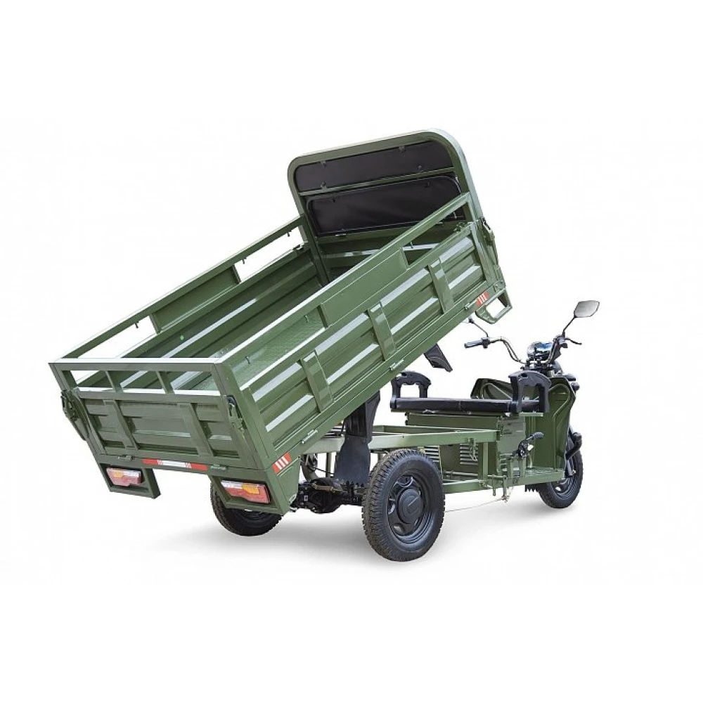 Вместительный кузов представлен размерами 1800 x 1250 x 475 мм (Д х Ш х В), имеет откидные борты, благодаря которым техника может использоваться на стройке и в сельском хозяйстве. Электротрицикл показывает высокую эффективность при выполнении погрузочно-разгрузочных работ.