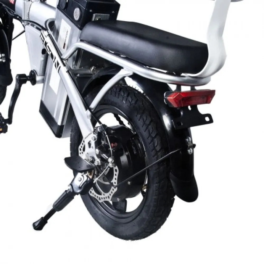 Мощность электромотора 350 Вт и емкости батареи – 12 А*ч достаточно для развития приличной скорости – до 45 км/час и преодоления расстояния до 42 км пути. Байк оснащен механическими тормозами и 14-дюймовыми накатистыми колесами. Батарея размещена за подседельной частью в специальном блоке. Основная конструкция рамы – заниженная, изготовлена из облегченного алюминия, дает возможность эксплуатации тс прекрасной половиной пола. Анатомическое переднее и пассажирское седло снижает нагрузку на позвоночник, исключает ощущение усталости.