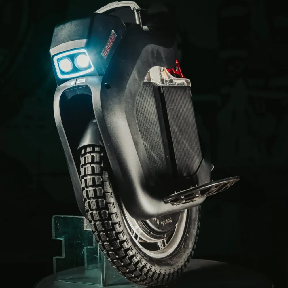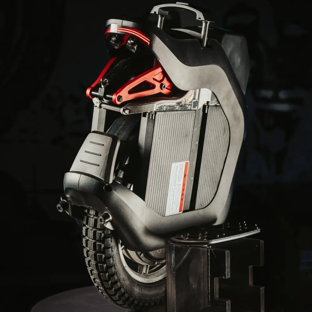 Моноколесо оснащено выдвигающейся телескопической ручки обеспечивает удобную транспортировку изделия. Педальная часть длинная, нескользящая благодаря шипам, не допускает случайного соскальзывания стоп. Яркая светодиодная фара с возможностью регулировки угла наклона допускает движение в ночное время и непогоду. Монохромный дисплей не дает бликов, удобный в эксплуатации, позволяет контролировать скорость, пробег и заряд батареи.