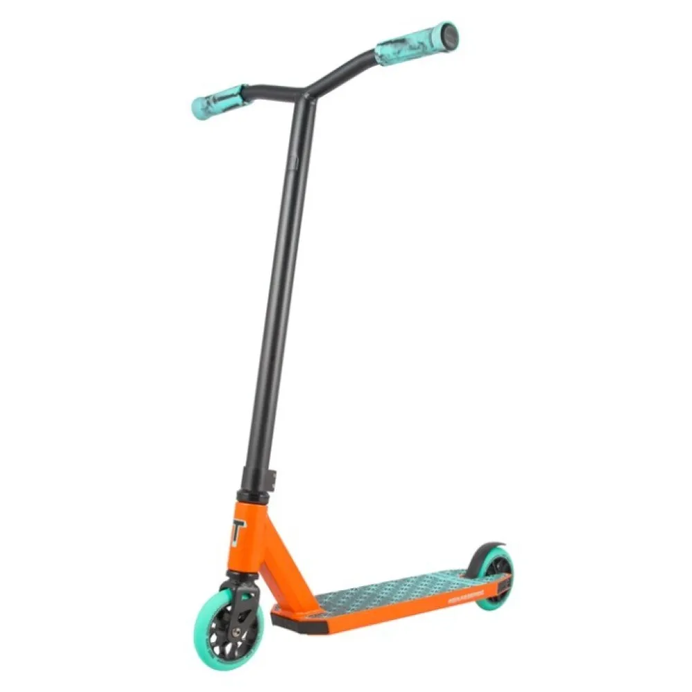 Трюковой самокат Techteam TT DUKER 202 2020 Оранжевый с первого взгляда производит впечатление своим привлекательным дизайном. Сочная расцветка с сочетанием оранжевых и бирюзовых элементов корпуса создаетт начинающим райдерам отличный настрой для освоения базовых элементов трюкового катания. Производители оснастили данную модель рулем оригинальной Y-образной формы, выполненным из прочной износостойкой стали. Крепление руля осуществляется зажимом на двух болтах с надежной системой HIC, что позволяет уверенно выполнять различные трюки. Резиновые грипсы имеют удобную форму и препятствуют соскальзыванию рук во время интенсивного движения. Стальная вилка получила обновленный дизайн, сохранив высокую прочность и способность выдерживать повышенные нагрузки. Колеса с алюминиевыми дисками сохранили оптимальный диаметр 110 мм и оснащены качественными подшипниками ABEC 9, которые обеспечивают хороший накат и бесшумное движение самоката. Алюминиевая дека с пластиковыми вставками отличается высокой прочностью и выдерживает нагрузку до 60 кг. Покрытие из мелкозернистой шкурки имеет оригинальный рисунок, который гармонично дополняет общий стиль изделия.